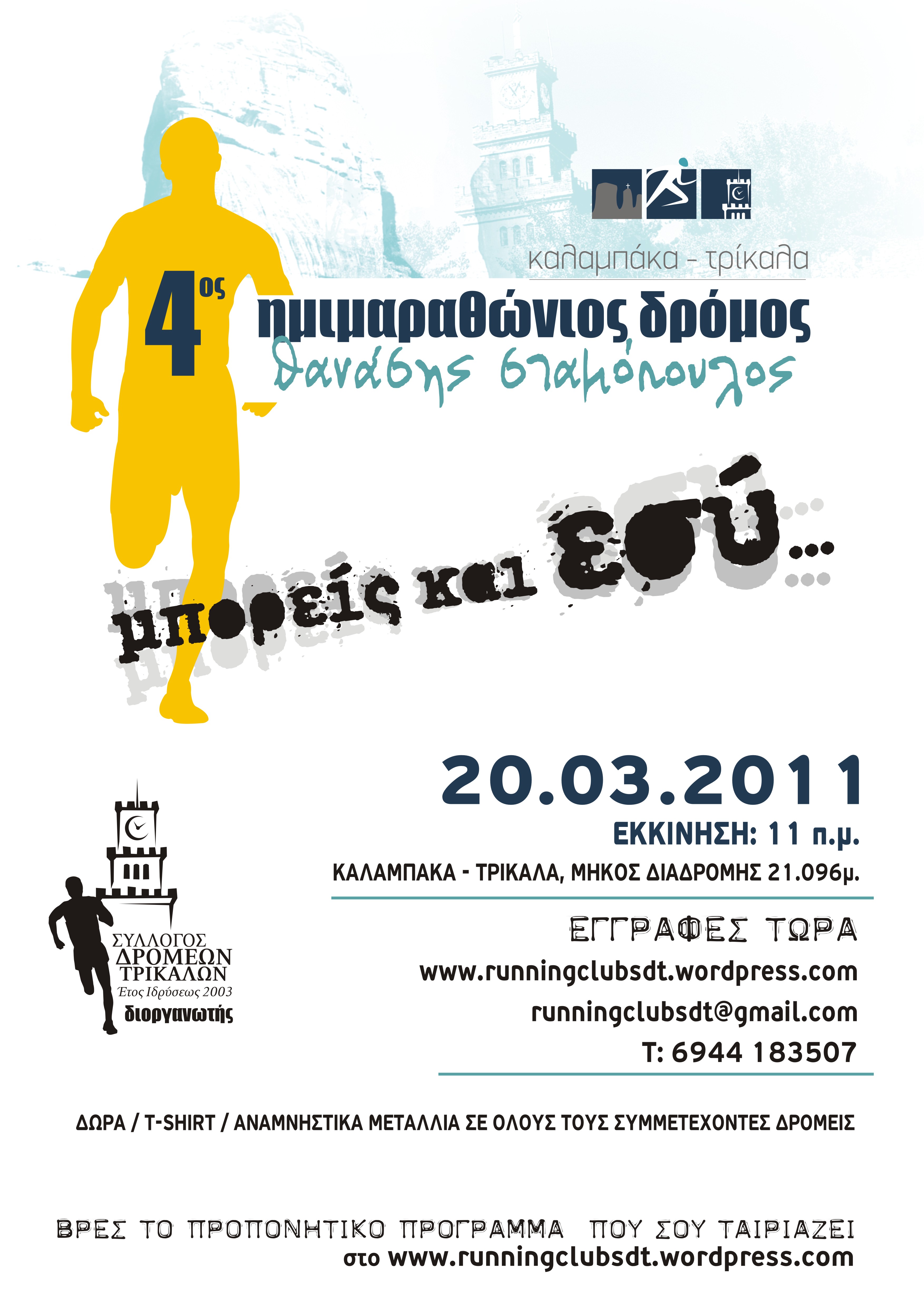 Ο Σύλλογος Δρομέων Τρικάλων ιδρύθηκε τον Ιούλιο του 2003. Από μία παρέα φίλων, που αποφάσισαν κάποια στιγμή να κάνουν πιο συλλογικές τις δράσεις τους, βοηθώντας τόσο τις δικές τους ανάγκες, αλλά δίνοντας την ευκαιρία και σε άλλους φίλους δρομείς, πιο διστακτικούς ίσως, που αγαπούσαν το τρέξιμο, να γίνουν και αυτοί μέρος της παρέας και των δράσεων του συλλόγου. Από τότε πέρασαν αρκετά χρόνια και μέσα σ’ αυτά ο σύλλογος μεγάλωσε τις δραστηριότητές του, έχοντας όμως πάντα ως σταθερό σημείο αναφοράς τη διοργάνωση και συμμετοχή σε λαϊκούς αγώνες δρόμου, που κρατάνε ζωντανό το ενδιαφέρον, τόσο κατά τη διάρκεια των προπονήσεων, όσο φυσικά και κατά τη διάρκεια της συμμετοχής στους αγώνες, που από μόνη της είναι μία εμπειρία μοναδική. Ένας από τους αγαπημένους αυτούς φίλους της παρέας και ιδρυτικό μέλος του συλλόγου αποτέλεσε και ο Θανάσης Σταμόπουλος. Συμπαθής σε όλους ξεχώριζε για το ήθος του και το χαρακτήρα του. Σαν δρομέας ξεχώριζε για το πάθος του και την επιμονή του και συνεχώς έβαζε νέους στόχους, που κάθε φορά τους πετύχαινε. Αλλά η ζωή είχε άλλα σχέδια. Ο Σύλλογος Δρομέων Τρικάλων για να τιμήσει τον αγαπημένο φίλο, πριν 3 χρόνια αποφάσισε να διοργανώσει τον 1ο Ημιμαραθώνιο Δρόμο «Θανάσης Σταμόπουλος», με αφετηρία την Καλαμπάκα και τερματισμό την κεντρική πλατεία Τρικάλων. Φέτος με τη συμπλήρωση τριών χρόνων στις 20 Μαρτίου του 2011 θα διεξαχθεί αισίως ο 4ος Ημιμαραθώνιος Δρόμος «ΘΑΝΑΣΗΣ ΣΤΑΜΟΠΟΥΛΟΣ», που πλέον έχει γίνει θεσμός και συνεχώς έχει ανοδική πορεία σε αγωνιστικό και οργανωτικό επίπεδο. Ο Σύλλογος Δρομέων Τρικάλων θεωρεί πως ο συγκεκριμένος αγώνας πέρα από το συμβολικό, αγωνιστικό και γιορτινό χαρακτήρα του, αποτελεί και για τους Τρικαλινούς μία πρώτης τάξεως ευκαιρία για να δοκιμάσουν τον εαυτό τους σε κάτι από το οποίο μόνο οφέλη μπορεί να κερδίσουν. Και το όφελος δεν είναι φυσικά μόνο ο τερματισμός στον αγώνα. Είναι όλη η διαδικασία. Από τη στιγμή, που για πρώτη φορά θα βάλεις τα αθλητικά σου παπούτσια για την πρώτη σου προπόνηση μέχρι και τον τερματισμό στον Ημιμαραθώνιο. Τα 20.069μ της διαδρομής μπορεί να φαίνονται ανυπέρβλητο εμπόδιο για κάποιους, αλλά στην πραγματικότητα δεν είναι. Το μόνο που χρειάζεται είναι ένα απλό και προοδευτικά αυξανόμενο πρόγραμμα εκγύμνασης, ώστε την ημέρα του Ημιμαραθωνίου να είναι κάποιος έτοιμος για να ανταπεξέλθει στα χιλιόμετρα της διαδρομής. Γι’ αυτό και παρακάτω παρουσιάζουμε ένα απλό πρόγραμμα εκγύμνασης για αρχάριους δρομείς, που θα τους βοηθήσει να προετοιμαστούνε κατάλληλα για να τερματίσουν τον αγώνα. Ακολουθώντας προσεκτικά τις προπονητικό πρόγραμμα και τις συμβουλές του Βασίλη Θεοχάρη προπονητή στίβου και μέλους του Δ.Σ. του συλλόγου ένα είναι σίγουρο.
