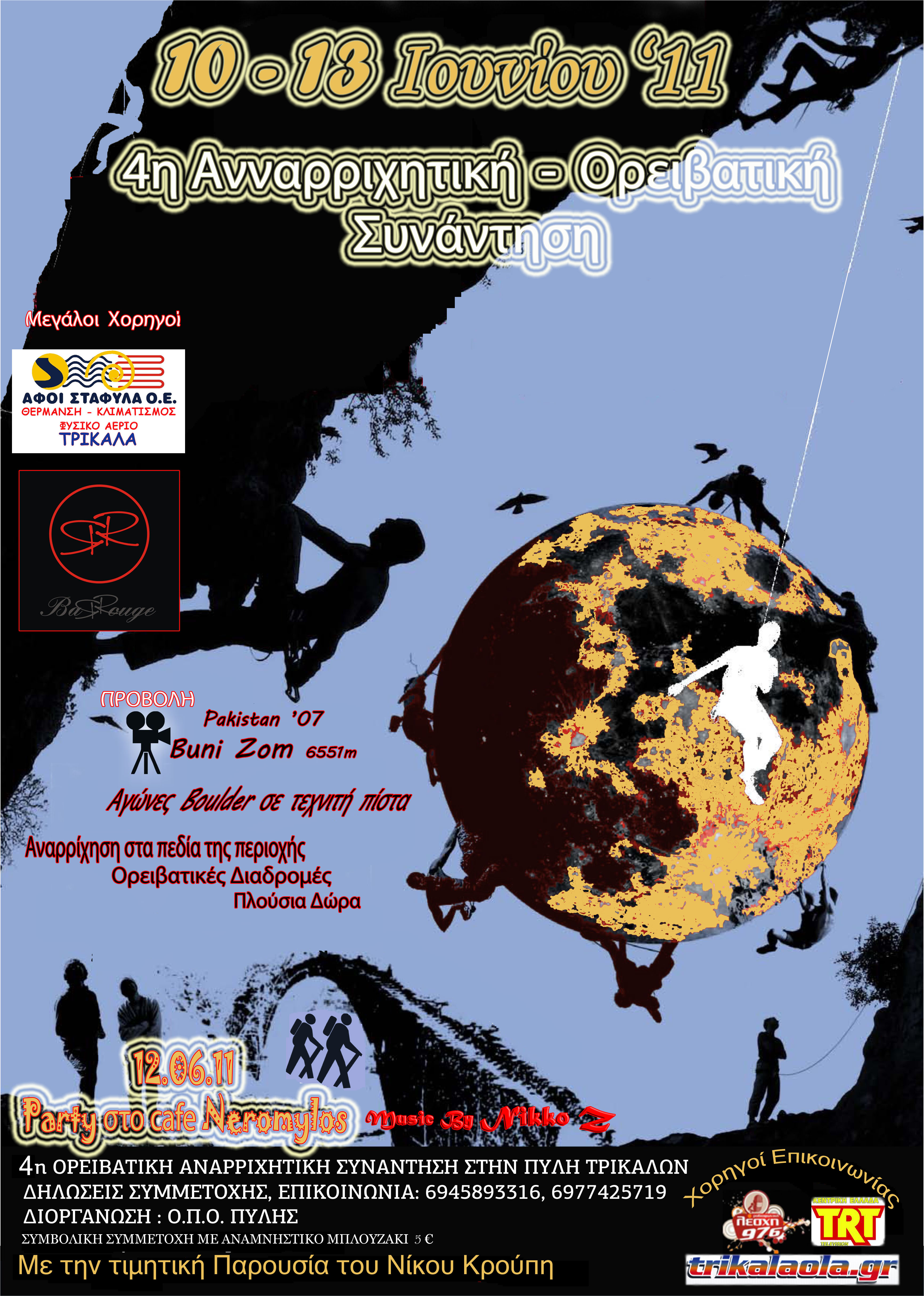 Ο Ορειβατικός Περιηγητικός Όμιλος Πύλης σας προσκαλεί στην 4η αναρριχητική-ορειβατική συνάντηση στην Πύλη Τρικάλων, η οποία έχει προγραμματιστεί για το τριήμερο του Αγίου Πνεύματος στις 10-13 Ιουνίου.. Στα πλαίσια της εκδήλωσης συγκεκριμένα ,πραγματοποιούνται 2 αναβάσεις σε διαδρομές των γύρω βουνών , ελεύθερη αναρρίχηση στα πεδία της περιοχής, διαγωνισμός Boulder σε τεχνητή πίστα του συλλόγου, η οποία θα στηθεί στην κεντρική πλατεία της Πύλης. Επίσης θα πραγματοποιηθούν και άλλες δραστηριότητες, όπως flying fox κτλπ, για τους μικρούς μας φίλους κατα τη διάρκεια των αγώνων. Οι συμμετέχοντες, αθλητές και μη θα διαμένουν προαιρετικά σε camping που θα στηθεί για τις ανάγκες του φεστιβάλ στην παραποτάμια περιοχή της Πύλης (όπου και θα προσφέρουμε δωρεάν πρωινό) δίπλα στο αναψυκτήριο Νερόμυλος, ή στα ξενοδοχεία της Πύλης σε προνομιακή τιμή (15€ κατα άτομο) κατόπιν συνενόησης με τους υπευθήνους.