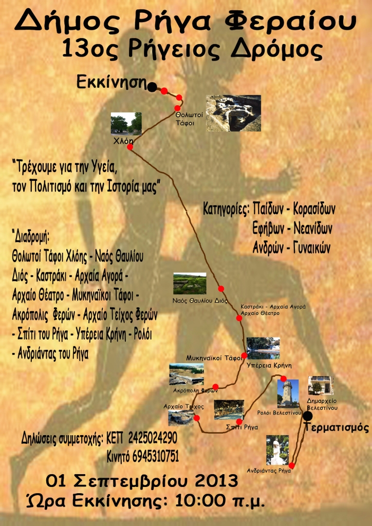 Ο Ρήγειος Δρόμος θα γίνει την Κυριακή 1η Σεπτεμβρίου 2013 με ώρα εκκίνησης 10.00π.μ.
