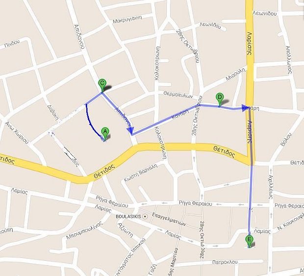 Εκκίνηση -> Φάρσαλα, Πηγές Απιδανού ποταμού -> οδός Θέτιδος προς Λαμία -> οδός Λαμίας -> Αρχαϊκός Θολωτός Τάφος -> δεξιά οδός Αθηνών -> οδός Λαρίσης αριστερά προς Λάρισα (Πεδιάδα των Φαρσάλων – Σιδηροδρομική Γραμμή – Βασιλί – Γέφυρα Ενιπέα – Δενδράκια) -> μετά το εργοστάσιο «ΕΠΙΛΕΚΤΟΣ» δεξιά προς Βαμβακού -> Βαμβακού -> Ρευματιά -> Ρευματιά (τελευταίος δρόμος δεξιά) -> οδός Βόλου – Φαρσάλων -> οδός Βόλου – Φαρσάλων δεξιά προς Φάρσαλα -> Φάρσαλα, οδός Βόλου -> οδός Θέτιδος δεξιά -> οδός Λαρίσης αριστερά -> Τερματισμός Πλατεία Δημαρχείου – Άγαλμα Αχιλλέα