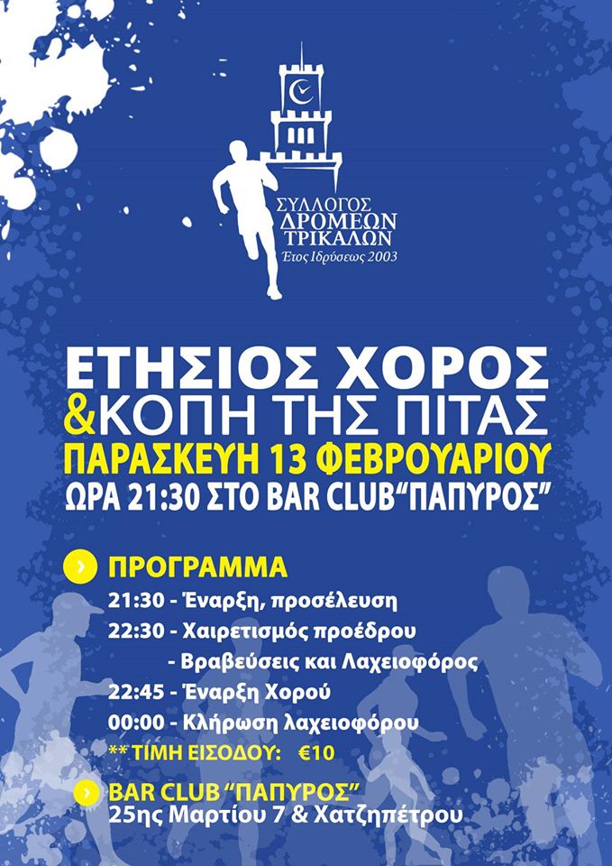Το Διοικητικό Συμβούλιο του Συλλόγου Δρομέων Τρικάλων σας προσκαλεί στον ετήσιο χορό και την κοπή της πίτας που θα πραγματοποιηθεί την Παρασκευή 13 Φεβρουαρίου 2015 στο «Bar Club ΠΑΠΥΡΟΣ» , 25ης Μαρτίου 7 & Χατζηπέτρου .