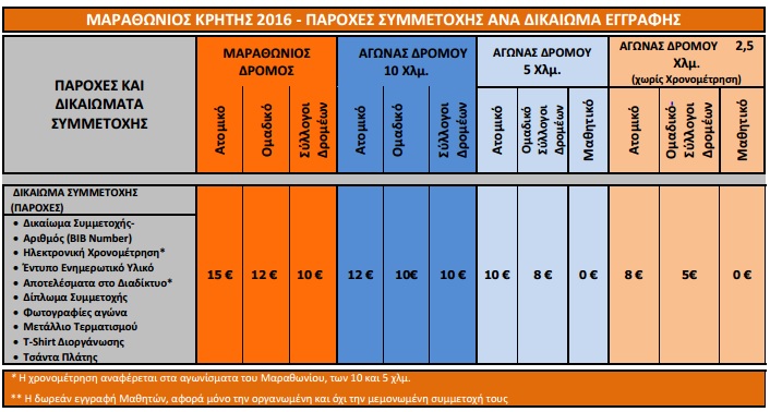 Π Ρ Ο Κ Η Ρ Υ Ξ Η “1 ος Μαραθώνιος Κρήτης – Crete Marathon” Κυριακή 8 Μαΐου 2016 Οι αγώνες σε δημόσια οδό περιλαμβάνουν: Μαραθώνιο δρόμο, αγώνα δρόμου 10 χλμ., αγώνα δρόμου 5χλμ. (δυναμικό βάδισμα και για μαθητές Γυμνασίων – Λυκείων) και αγώνα δρόμου για όλους 2,5χλμ, (δυναμικό βάδισμα και για μαθητές Δημοτικών Σχολείων). Παράλληλα θα διοργανωθεί για πρώτη φορά στην Ελλάδα η συμμετοχική Μαραθώνια Ποδηλατοδρομία (θα ακολουθήσει ειδική προκήρυξη). Όλες οι διοργανώσεις θα διεξαχθούν σύμφωνα με τους παρακάτω όρους: 1. ΗΜΕΡΟΜΗΝΙΑ ΔΙΕΞΑΓΩΓΗΣ ΑΓΩΝΩΝ: Κυριακή 8 Μαΐου 2016 2. ΑΦΕΤΗΡΙΑ – ΤΕΡΜΑΤΙΣΜΟΣ: Όλες οι διαδρομές θα έχουν ως αφετηρία και τερματισμό τον οριοθετημένο χώρο της Παλαιάς Αγοράς των Χανίων.