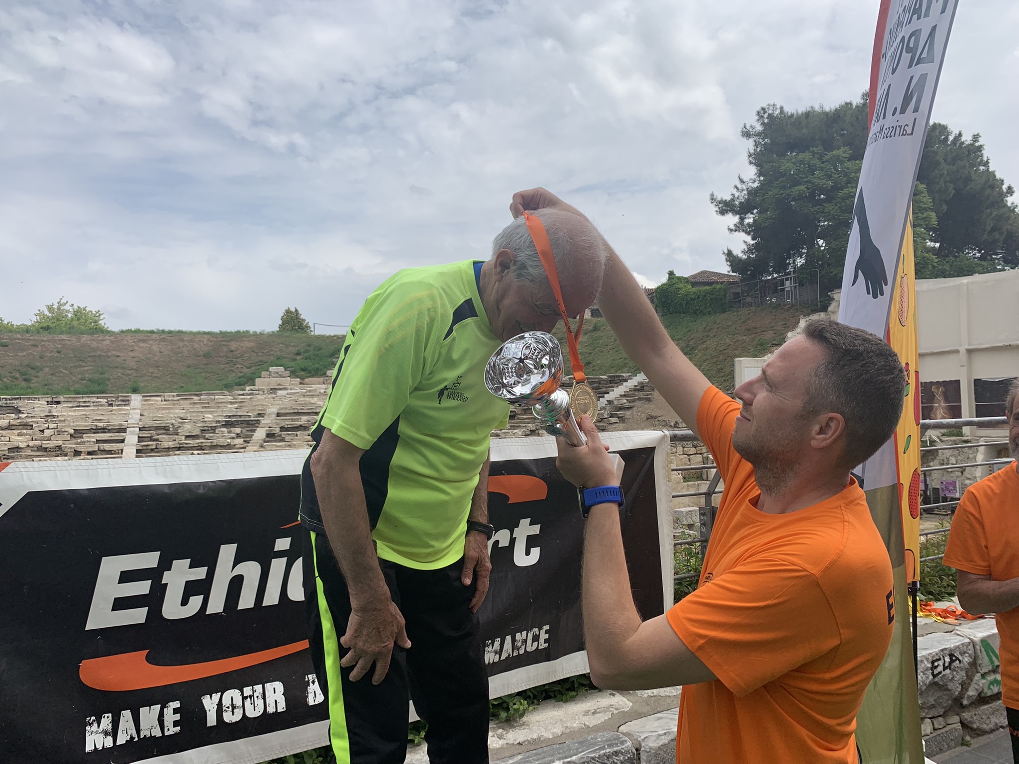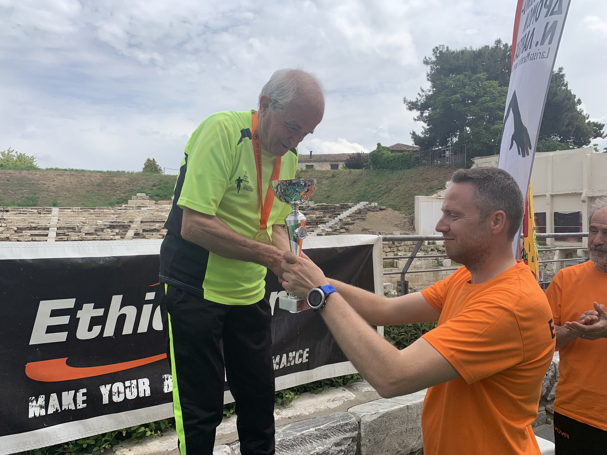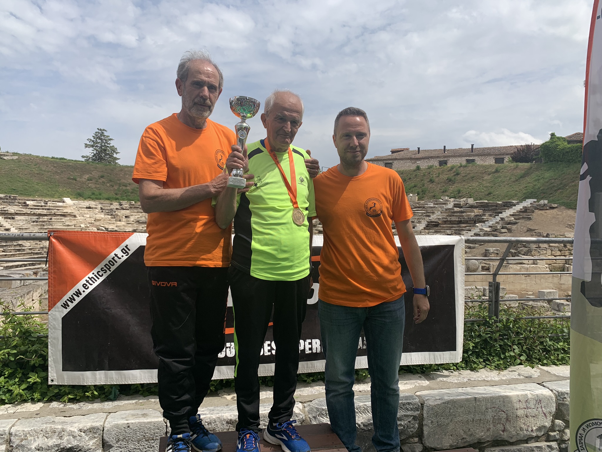 Τέλος, ο έβδομος δρομέας μας που ανέβηκε στο βάθρο ήταν ο Γιώργος Θέμελης . Ο κύριος Γιώργος , βραβεύθηκε από τους διοργανωτές ως ο μεγαλύτερος δρομέας που τερμάτισε , παραλαμβάνοντας το κύπελό του καταχειροκροτούμενος από θεατές , διοργανωτές και δρομείς.