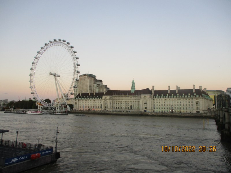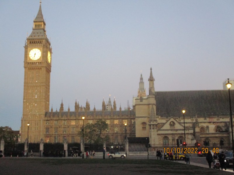 Μετά την προσγείωση στο Λονδίνο την 10 Οκτ. υπήρχε χρόνος μόνο για μια νυκτερινή επίσκεψη στο Ουέστμινστερ, το περίφημο βρετανικό κοινοβούλιο έμπροσθεν του οποίου δεσπόζει ο Μπιγκ Μπεν, ο πύργος του ρολογιού που δείχνει την ώρα με την οποία συγχρονίζονται τα ρολόγια όλου του πλανήτη. Παραπλεύρως και στην απέναντι νότια όχθη του ποταμού Τάμεση δεσπόζει επίσης ένα άλλο σήμα κατατεθέν της πόλης, νεότερο του Μπιγκ Μπεν, το Μάτι του Λονδίνου (the London Eye),τεράστια μεταλλική ρόδα ύψους 135μ. με διάμετρο τροχού 120μ., κατασκευής 2000, θέαμα υπέροχο. Το Ουέστμινστερ, κάποτε κέντρο της βασιλικής εξουσίας και τώρα Βουλή, μαζί με το παρακείμενο ομώνυμο αββαείο, όπου στέφονται και θάπτονται οι βρετανοί μονάρχες, άρχισαν να κτίζονται περί το 1200 και χρειάστηκαν αιώνες για να λάβουν την σημερινή μορφή τους. Περικαλλείς κήποι με λιμνούλες περιβάλλουν τον χώρο, εγγύς του οποίου υπάρχει το περίφημο Παλάτι του Μπάκιγχαμ, οικία της βασιλικής οικογένειας, ο στερεότερος θεσμός της βρετανικής κοινωνίας (ο βασιλιάς Φαρούκ της Αιγύπτου είπε κάποτε οτι οι μοναδικές βασίλισσες που θα μείνουν στον κόσμο θα είναι η βασίλισσα του σκακιού και η βασίλισσα της Αγγλίας). Εντύπωση όσο και συγκίνηση προκαλεί ένα επιβλητικό κτίριο όχι μακρυά από το παλάτι, το περίφημο Churchill’s War House (Κτίριο Πολέμου του Τσώρτσιλ) όπου στις πιο σκοτεινές ώρες του Β’ Παγκ. Πολέμου το 1940-41, όταν το Λονδίνο βομβαρδιζόταν αγρίως από την γερμανική αεροπορία, ο μέγας Τσώρτσιλ, πρωθυπουργός τότε, διηύθηνε τον πόλεμο ακλόνητος και υποσχόμενος μόνον αίμα, ιδρώτα και δάκρυα.