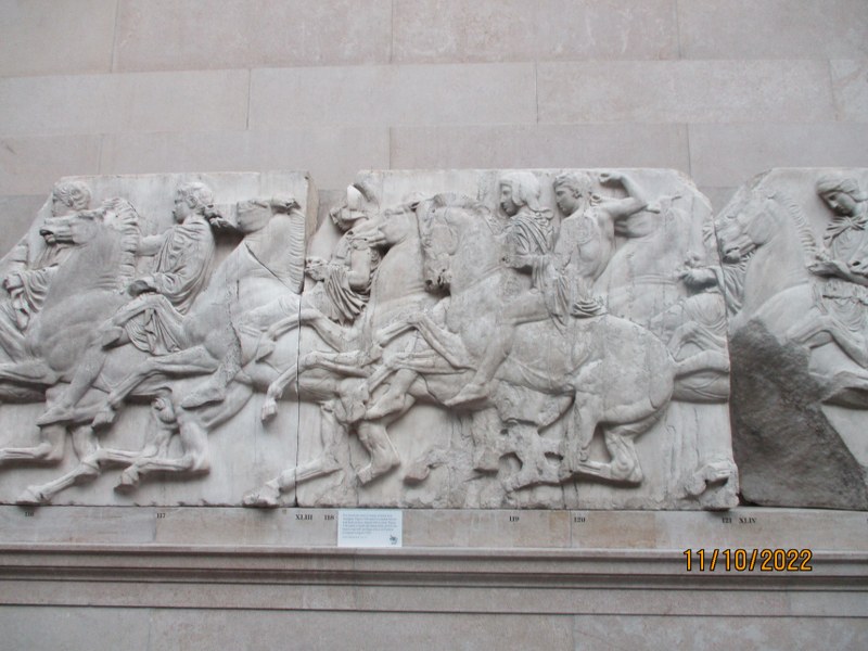 Η επόμενη ημέρα, 11 Οκτ. ήταν αφιερωμένη στην επίσκεψη στο Βρετανικό Μουσείο. Το μουσείο αυτό είναι ένα από τα μεγαλύτερα και σπουδαιότερα του κόσμου και εκεί φυλάσσονται στοιχεία και αντικείμενα των πολιτισμών όλης της υφηλίου. Αν λάβουμε υπόψιν μας οτι στην κάποτε αποικιακή βρετανική αυτοκρατορία ο ήλιος δεν έδυε ποτέ, αντιλαμβανόμαστε οτι η μορφωμένη ελίτ της αυτοκρατορίας αυτής δεν εφείσθησαν κόπων, χρημάτων και άλλων μεθόδων για να συγκεντρώσουν στην πρωτεύουσά τους πολιτιστικούς θησαυρούς των χωρών που ήταν υπό την εξουσία τους. Όπως και να έχει το θέμα στο Βρετανικό Μουσείο παρουσιάζεται ανάγλυφα η πορεία όλης της ανθρωπότητας, οι κουλτούρες και οι πολιτισμοί, οι απαρχές της γνώσης, η άνοδος και η πτώση αυτοκρατοριών και πολιτισμών, ένα πράγμα που αξίζει να δει κανείς μια φορά έστω στην ζωή του και η περιγραφή του οποίου εκφεύγει των ορίων του παρόντος. Μια αίθουσα ενδιαφέρει ιδιαιτέρως τους Έλληνες, όλους τους Έλληνες, ανεξαρτήτως τάξεως, μορφώσεως, ιδεολογίας ή πίστης. Η αίθουσα των Μαρμάρων του Παρθενώνα. Στην αίθουσα αυτή (ιδιαιτέρως μεγάλη) παρουσιάζονται όλα τα γλυπτά του Φειδία που κάποτε κοσμούσαν το υπέρτατο σύμβολο της Αρχαίας Ελλάδας, τον Παρθενώνα, έργο του Περικλή κατά τον 5ο αιώνα π.Χ. Η ομορφιά τους σου παίρνει την ανάσα. Από τον ναό του Παρθενώνα ξεκίνησε όλος ο λεγόμενος σήμερα δυτικός πολιτισμός. Ρίγος με κατέλαβε και το κάλλος της ελληνικής τέχνης με καθήλωσε. Ο γράφων κρίνει απαραίτητο να αναφέρει εδώ εν συνόψει το κείμενο του μουσείου στην είσοδο της αίθουσας. »Ο λόρδος Μπρους (Έλγιν), πρόξενος της Βρετανίας στην Αθήνα το 1801, φανατικός αρχαιολάτρης και ερευνητής, είδε την παραμέληση του ναού του Παρθενώνα και την κακή κατάσταση των γλυπτών στις μετόπες μετά από αιώνες παραμέλησης και εγκατάλειψης. Προκάλεσε διάταγμα (φιρμάνι σουλτανικό) για αγορά αυτών και μεταφορά στην Βρετανία για την διατήρηση και συντήρησή τους». Όπως όμως γνωρίζουμε, η τουρκική κυβέρνηση επί πρωθυπουργίας Ερντογάν, μετά από έρευνα δεν βρήκε τέτοιο φιρμάνι και γνωστοποίησε αυτό στην Ελλάδα. Τα γλυπτά αφαιρέθηκαν με δωροδοκία του Οθωμανού διοικητή και η Ελλάδα θεωρεί αυτή την ενέργεια κλοπή. Όσο υπάρχει Ελλάδα το ζήτημα θα εκκρεμεί και θα τα ζητούμε πίσω. Όσο »για την διατήρηση και συντήρησή τους» ας μην ανησυχεί κανείς. Δεσμευόμαστε γι’αυτό.