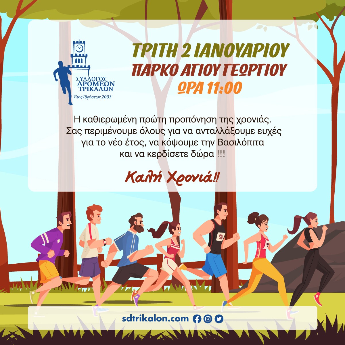 Την Τρίτη 2 ιανουαρίου το πρωί στις 11:00 ραντεβού στο πάρκο του Άη Γιώργη για να κάνουμε όλοι μαζί την καθιερωμένη πρώτη προπόνηση της χρονιάς! Σας περιμένουμε όλους για να ανταλλάξουμε ευχές για το νέο έτος , να κόψουμε την Βασιλόπιτα και να κερδίσετε δώρα !!!