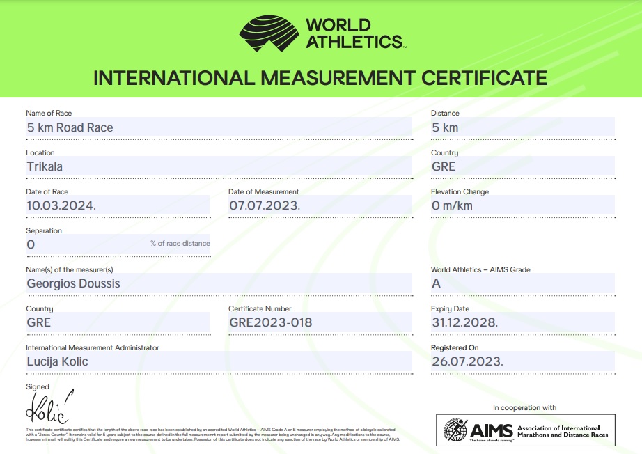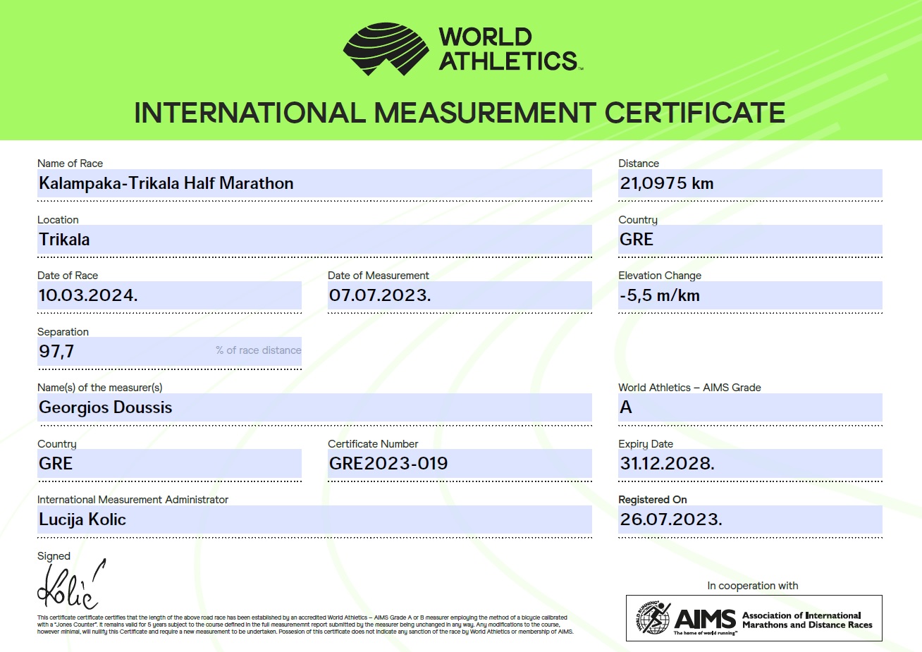 Πριν λίγους μήνες πραγματοποιήθηκε η επαναμέτρηση της διαδρομής του Ημιμαραθωνίου δρόμου «Θανάσης Σταμόπουλος» Καλαμπάκα-Τρίκαλα και η επίσημη μέτρηση για πρώτη φορά της διαδρομής των 5 χλμ. . Την μέτρηση της διαδρομής έκανε ο κύριος Δούσσης Γεώργιος, ο οποίος είναι πιστοποιημένος επιθεωρητής της AIMS/IAAF.
