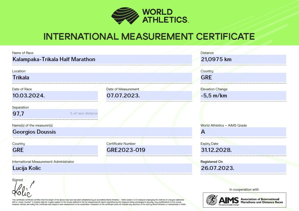 Ακολούθησε η πλήρης έκθεση της μετρημένης διαδρομής από τον κύριο Δούσση και η αποστολή των στοιχείων στην AIMS (Association of International Marathon and Distance Races) απ’ όπου μετά από λίγες ημέρες ήρθε και πιστοποίηση εκ νέου της διαδρομής για τα επόμενα 5 χρόνια και η ένταξη του Ημιμαραθώνιου «Θανάσης Σταμόπουλος» στο διεθνές καλεντάρι της. Η διάρκεια της προηγούμενης πιστοποίησης είχε λήξει τον προηγούμενο Απρίλιο και η οργανωτική επιτροπή θεώρησε απαραίτητη την ανανέωσή της τόσο για το κύρος του αγώνα ,όσο και για την αξιοπιστία του που τον κατατάσσει ανάμεσα στους μεγαλύτερους της χώρας μας. Έτσι, πέρα από το ότι πλέον ο αγώνας θα ανήκει σε μια παγκόσμια ομοσπονδία αγώνων δρόμου, στην οποία υπάγονται όλοι οι σπουδαίοι μαραθώνιοι και ημιμαραθώνιοι του κόσμου , το σημαντικότερο είναι ότι ο αγώνας εντασσόμενος στο παγκόσμιο καλεντάρι αγώνων της AIMS, στο οποίο ανατρέχουν εκατομμύρια δρομείς από όλο τον κόσμο, θα έχει τη δυνατότητα με τον κατάλληλο σχεδιασμό, να γίνει διεθνής, και στο νομό Τρικάλων να έρθουν και δρομείς από άλλες χώρες, συνδυάζοντας τον αγώνα και με μία εκδρομή και στα άλλα υπέροχα αξιοθέατα της περιοχής.