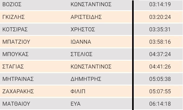 Ο Σύλλογός μας εκπροσωπήθηκε στον συγκεκριμένο αγώνα με 9 δρομείς μας . Ο Κωνσταντίνος Βόζιος πέτυχε την καλύτερη επίδοση από τα μέλη μας , καθώς τερμάτισε σε 3:14:19 κατακτώντας την 12η θέση στην γενική . Στις γυναίκες η Ιωάννα Μπάτζιου τερμάτισε σε 3:58:16 , 6η γυναίκα και 1η στην ηλικιακή της κατηγορία. Δείτε αναλυτικά τα αποτελέσματα των δρομέων μας :