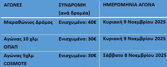 | ΑΓΩΝΑΣ ΔΡΟΜΟΥ 30K & ΔΥΝΑΜΙΚO ΒΑΔΙΣΜΑ | 21 / 09 /2025 ΩΡΑ ΕΚΚΙΝΗΣΗΣ: 8:15 π.μ. | 20€ |